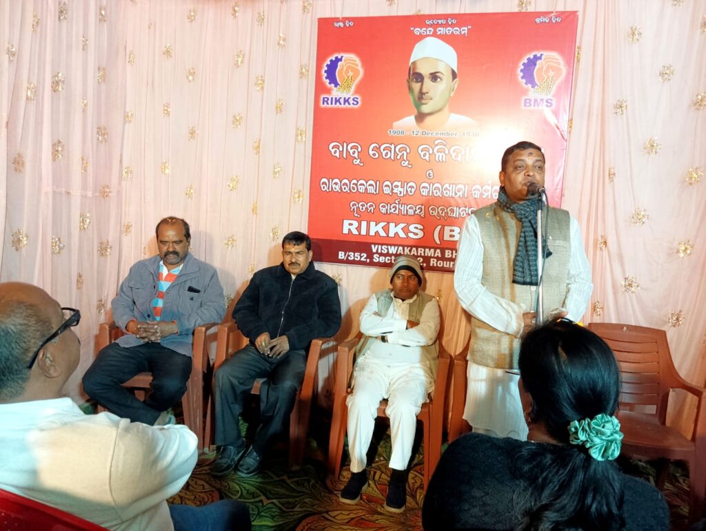 राउरकेला 13/12:(कलिंग समाचार)स्वदेशी वस्त्रों के उपयोग के लिए ब्रिटिश शासन के दौरान मुंबई में विदेशी वस्त्रों से लदे एक ट्रक के सामने लेटकर अपने जीवन का पहला बलिदान देने वाले बाबू गेनू के शहीद दिवस के अवसर पर, भारतीय मजदूर संघ (BMS) पूरे देश में 12 दिसंबर को यह दिवस मनाता आ रहा है।ऐसे ही एक पवित्र दिन पर, राउरकेला सारनगरी स्थित बीएमएस कार्यालय का उद्घाटन राष्ट्रीय स्वयंसेवक संघ के वरिष्ठ प्रचारक विष्णु चरण पात्र द्वारा किया गया। गृह प्रवेश या कार्यालय प्रवेश से पहले, हिंदू रीति-रिवाजों के अनुसार बी.आई.के.के.एस. के वरिष्ठ कार्यकर्ता राजेंद्र महंत की देखरेख में होमयज्ञ का आयोजन किया गया था।इस कार्यक्रम में मुख्य वक्ता विष्णु पात्र ने शहीद बाबू गेनू के बलिदान को याद किया और कहा कि सारनगरी में बीएमएस कार्यालय का उद्घाटन होना लोगों का लंबे समय से देखा गया सपना साकार होने जैसा है।बी.आई.के.के.एस. की ओर से गंगपुर मजदूर सभा के महासचिव गोपाल दास को कार्यालय उद्घाटन में शामिल होने के लिए धन्यवाद दिया गया। कार्यक्रम की अध्यक्षता प्रदोष पंडा ने की, जबकि विवेकानंद महांत ने सभी को धन्यवाद ज्ञापित किया।इस कार्यक्रम को सफल बनाने में उमाकांत सामल, विकास प्रधान, संजय दास, प्रताप पटनायक, बासु नाथ, नरनाथ कुँवर, उत्तम जेना, रवि गुप्ता, अनिल गुप्ता, गांधी नायक, बुटू सामल, बैकुंठ पात्र, रवि घड़ेई आदि का विशेष योगदान रहा।