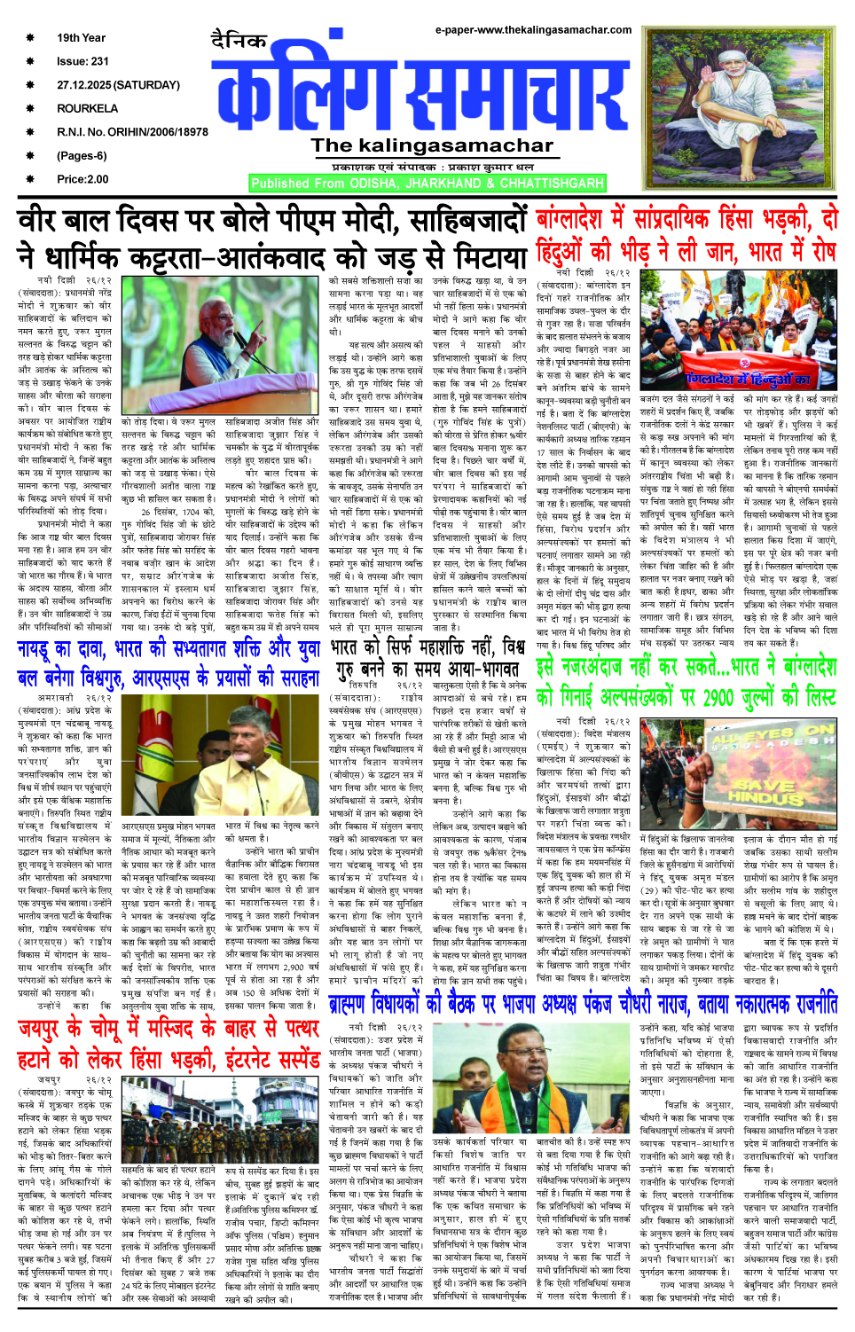 E-Paper 27-12-2025 The Kalinga Samachar December 28, 2025 Spread the love 1_compressedDownload About the Author The Kalinga Samachar Administrator Visit Website View All Posts Post Views: 17 Continue Reading Previous: लायंस फेट–2025 : 25 दिसंबर को भव्य आयोजन, जनसैलाब के बीच सफल समापनNext: 29.12.2025 Leave a Reply Cancel replyYour email address will not be published. Required fields are marked *Comment * Name * Email * Website Save my name, email, and website in this browser for the next time I comment. Related News E-Paper 6-2-2026 The Kalinga Samachar February 6, 2026 E-Paper 4-2-2026 The Kalinga Samachar February 5, 2026 E-Paper 28-1-2026 The Kalinga Samachar January 29, 2026