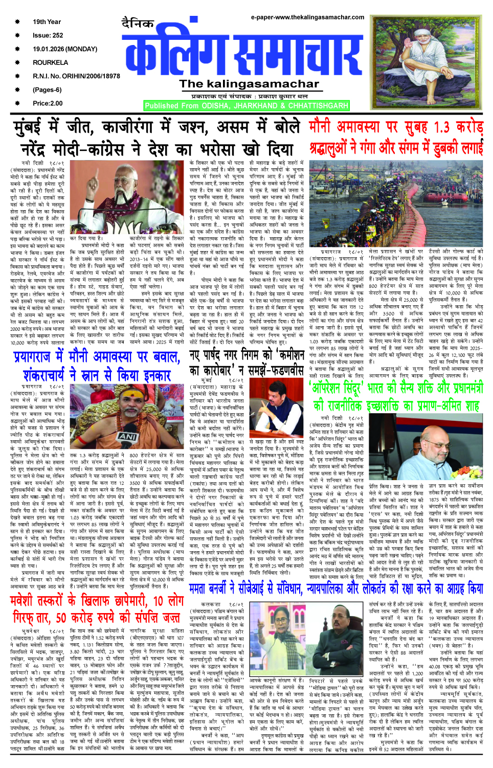E-Paper 19-1-2025 The Kalinga Samachar January 19, 2026 Spread the love 1_compressedDownload About the Author The Kalinga Samachar Administrator Visit Website View All Posts Post Views: 4 Continue Reading Previous: राउरकेला में पहली बार स्कीपिंग प्रतियोगिताNext: ट्रैक्टर की चपेट में आने से 2 वर्षीय मासूम की मौत, इलाके में तनाव Leave a Reply Cancel replyYour email address will not be published. Required fields are marked *Comment * Name * Email * Website Save my name, email, and website in this browser for the next time I comment. Related News E-Paper 6-2-2026 The Kalinga Samachar February 6, 2026 E-Paper 4-2-2026 The Kalinga Samachar February 5, 2026 E-Paper 28-1-2026 The Kalinga Samachar January 29, 2026